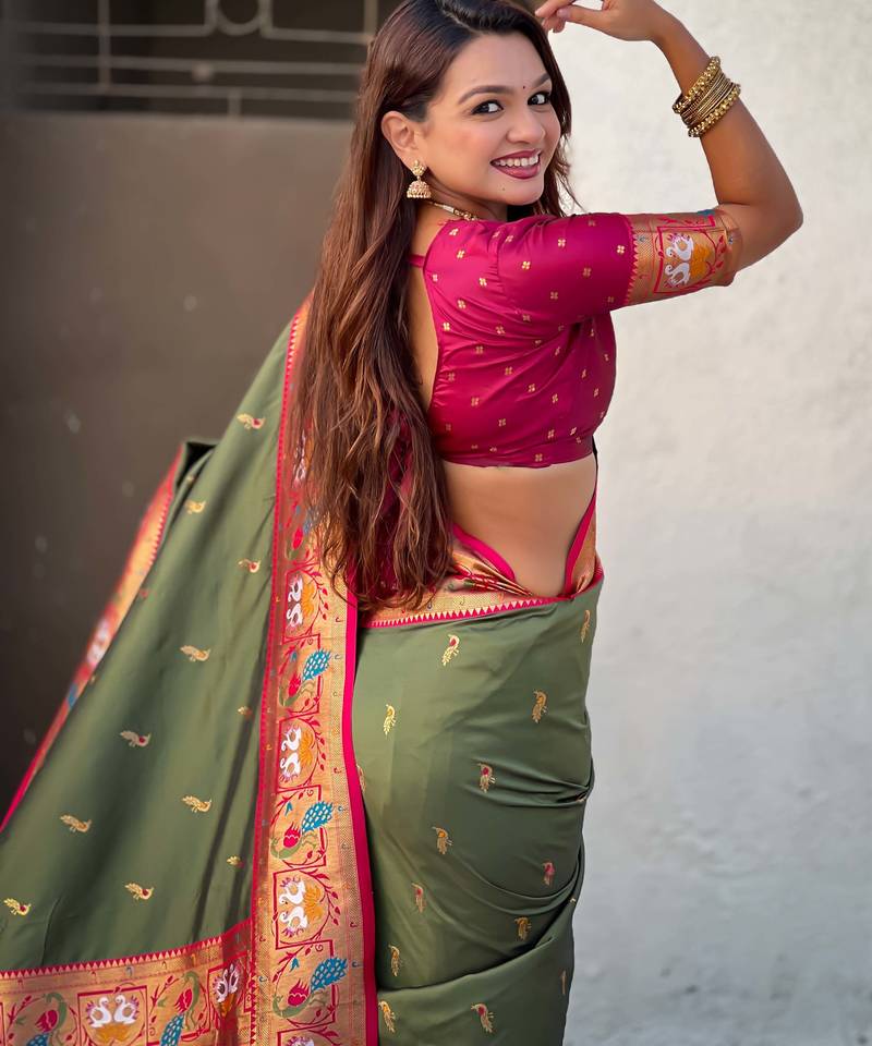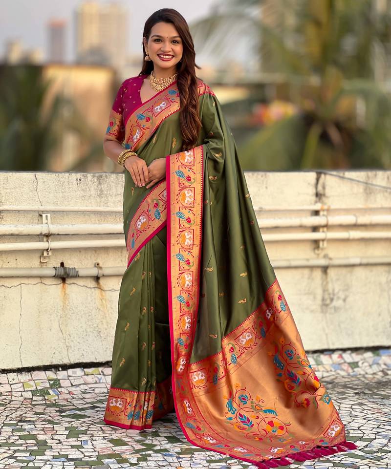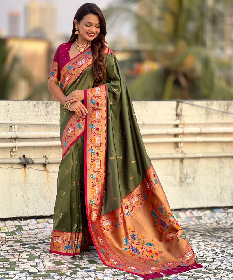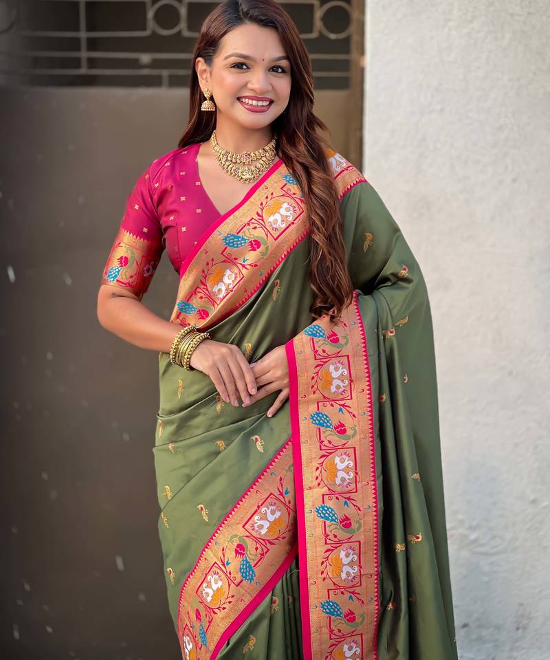 | Product Description | Discover The Timeless Elegance Of This Soft Silk Swan Rajhans Paithani Saree, A Masterpiece Of Traditional Indian Weaving. Adorned With Intricate Gold Zari Meenakari Peacock Motifs Throughout The Body, This Saree Showcases The Finest Craftsmanship. The Standout Feature Is The Richly Woven Swan Meenakari Paithani Pallu, Complemented By An Exquisite Meenakari Swan Fancy Border That Adds Distinctive Character. The Contrast Brocade Blouse, Perfectly Coordinated With The Saree's Design, Completes This Sophisticated Ensemble. Each Element Reflects Authentic Paithani Artistry, Making This Saree An Ideal Choice For Special Occasions And Celebrations Where Refined Taste Meets Cultural Heritage. |