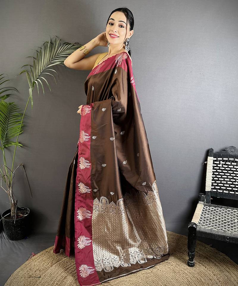 Brown soft silk blend small butti jacquard zari weaving banarasi saree
