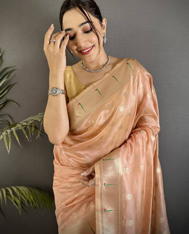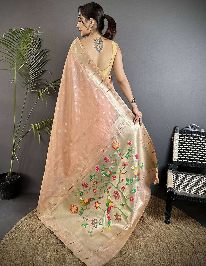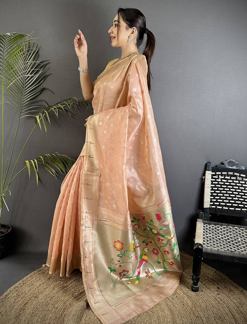 Coral pink tissue parrot & floral woven design paithani saree