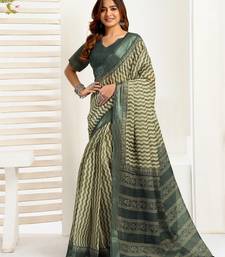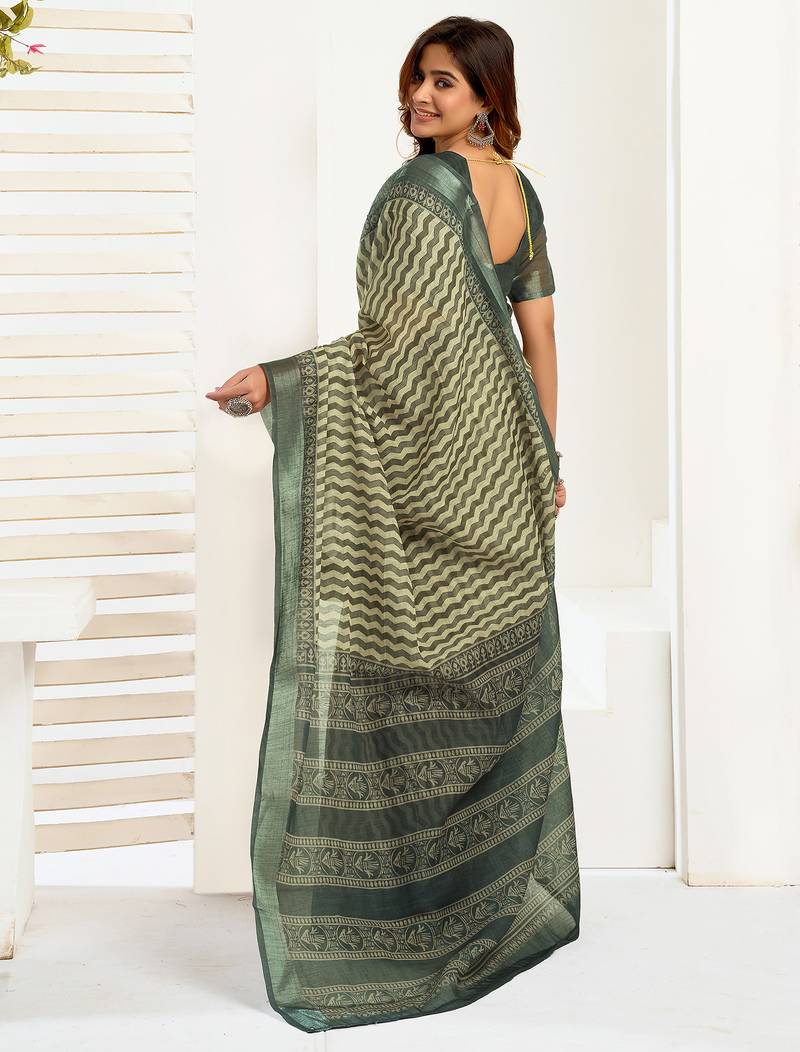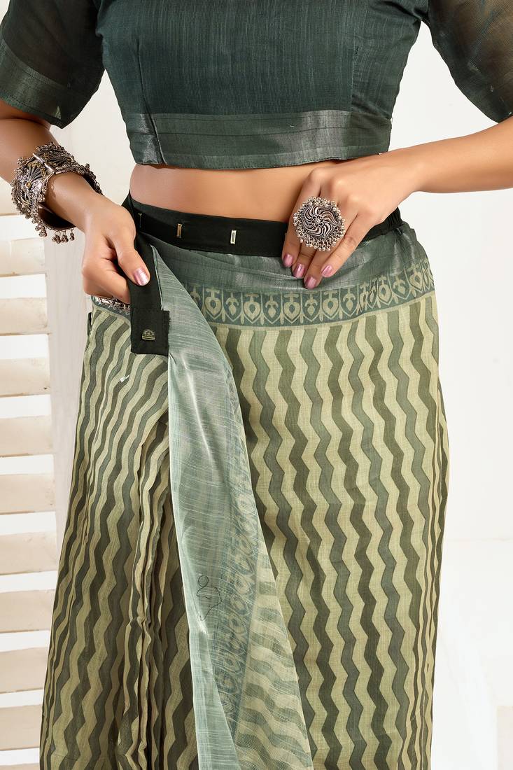 Product Name Dark Green Linen Zig Zag & Chevron Printed Ready To Wear Saree With Pocket