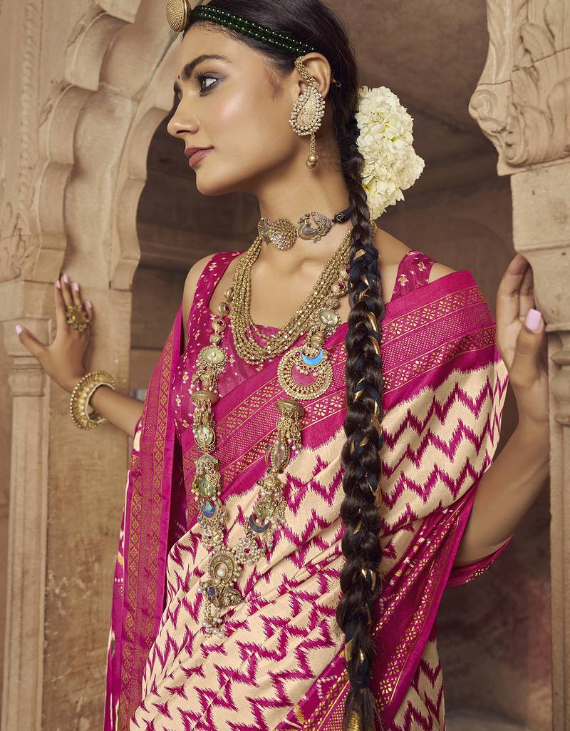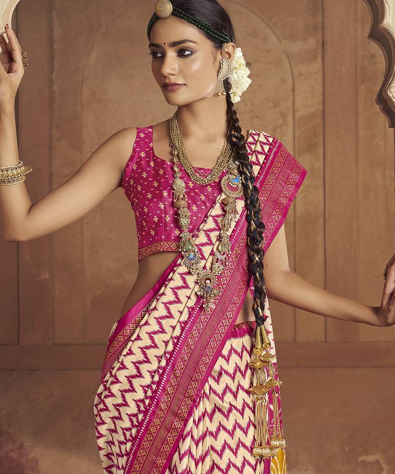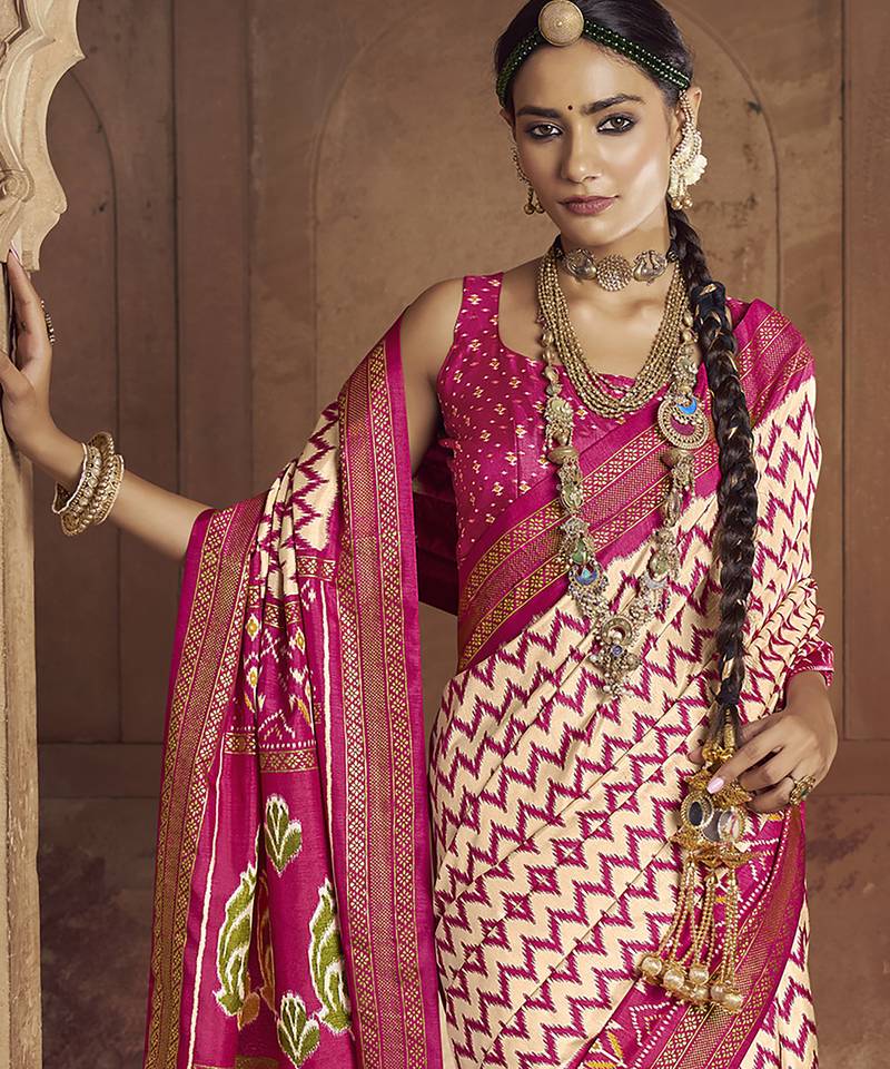 | Product Name | Cream Soft Silk Blend Ikkat Printed Patola Saree | |