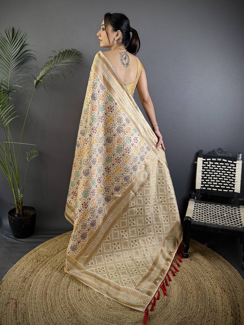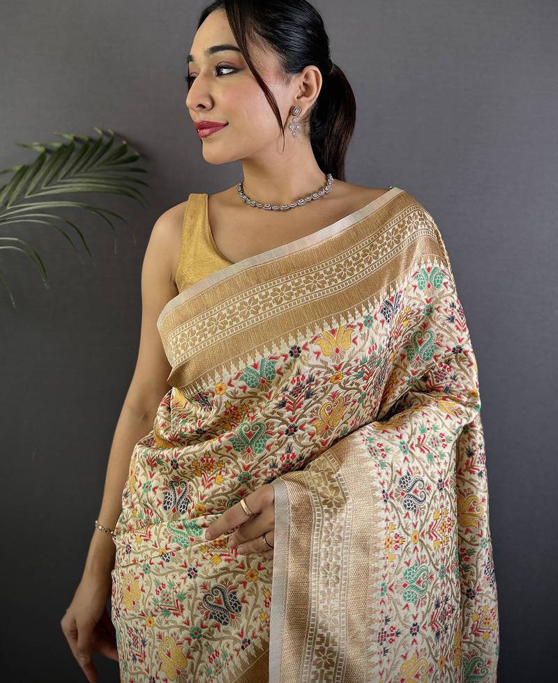 cream soft silk blend intricate floral & paisley motifs zari weaving banarasi saree