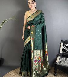 Dark green lichi silk blend parrot & floral woven design zari weaving paithani saree