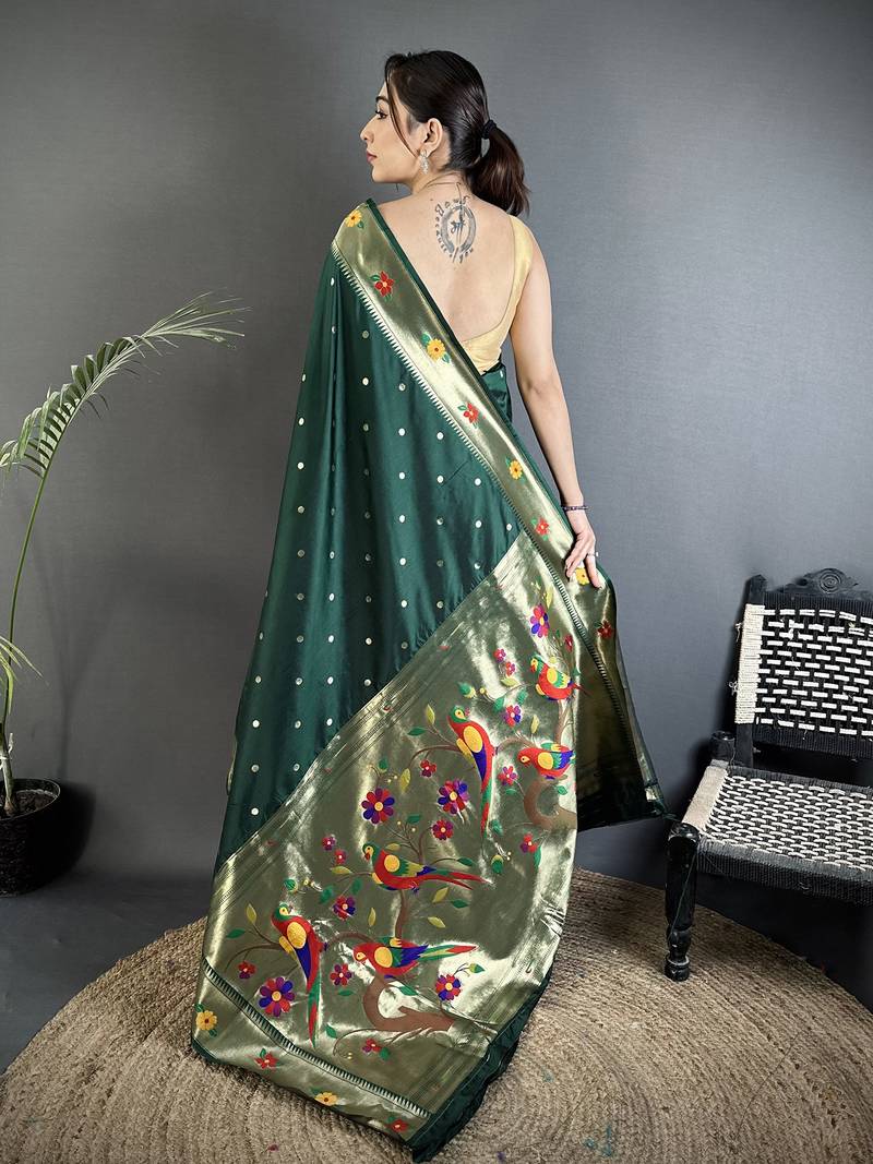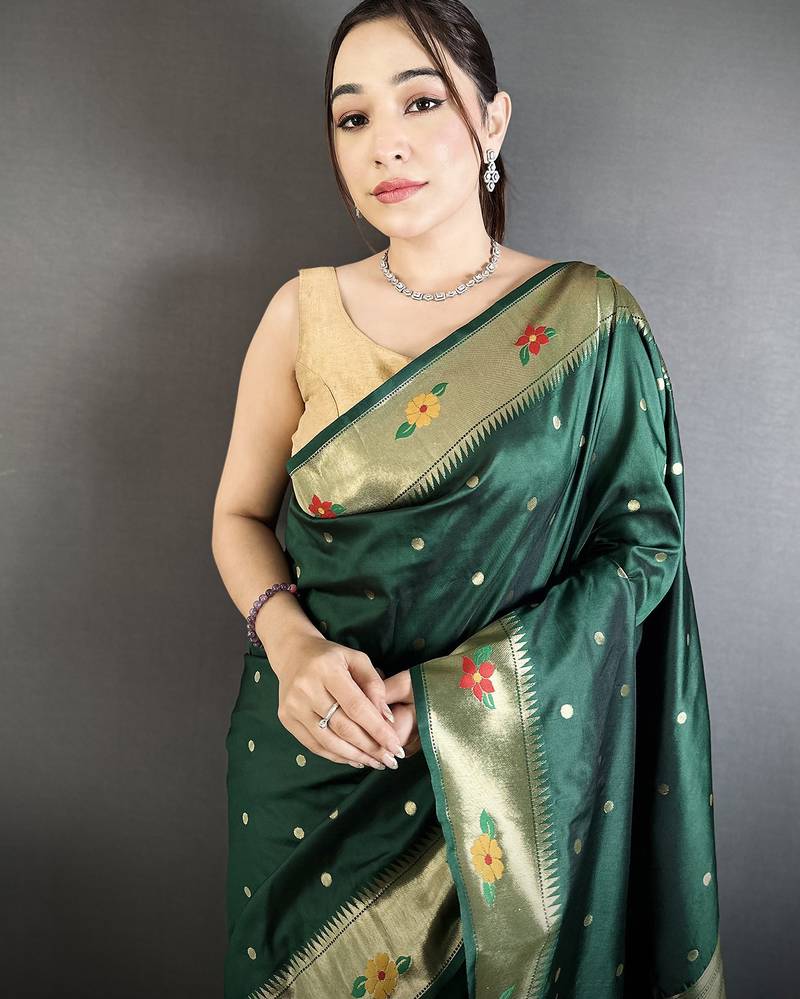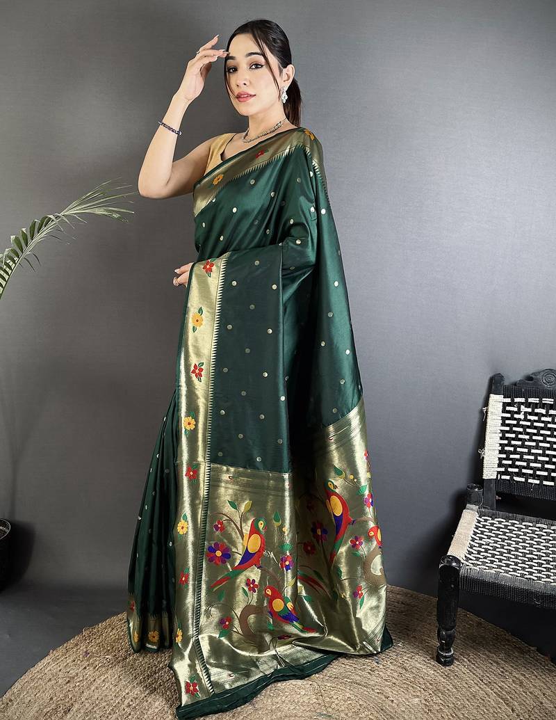 Ideal For Bridal Trousseau And Festive Gifting, This Traditional Paithani Silk Saree Blends Heritage With Refined Beauty. Elevate Your Ethnic Wardrobe With This Elegant Dark Green Silk Saree That Embodies Premium Quality, Exquisite Craftsmanship, And Timeless Appeal.