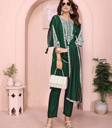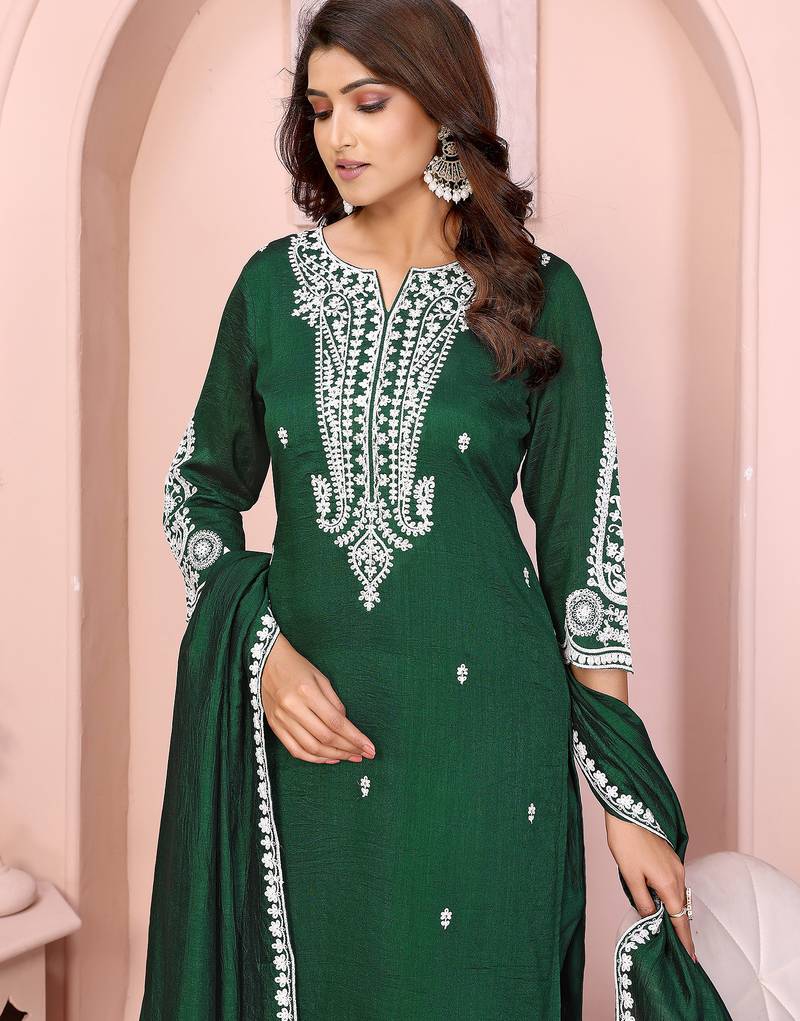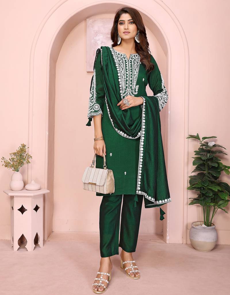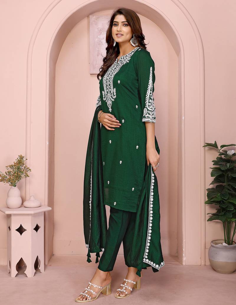 | Product Description | The Dark Green Vichitra Silk Kurta Set Is Crafted From Soft, Luxurious Vichitra Silk, Making It Perfect For Festive Occasions, Office Events, Or Casual Gatherings. The Straight Kurta Provides A Relaxed Yet Flattering Fit That Gracefully Skims Your Body, Enhanced By A Chic Notch Neckline And Intricate Floral Embroidery For A Timeless, Elegant Look. This Complete Three Piece Set Includes A Comfortable Kurta, Coordinating Bottom, And Matching Dupatta, Offering Effortless Ethnic Style For Any Occasion. With An Inclusive Size Range, You Can Easily Find Your Perfect Fit. Fabric: Vichitra Silk (Soft & Luxurious)