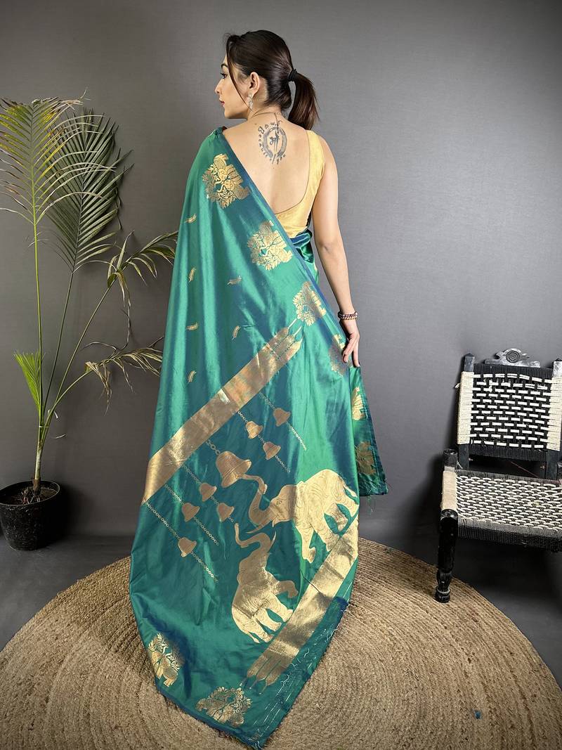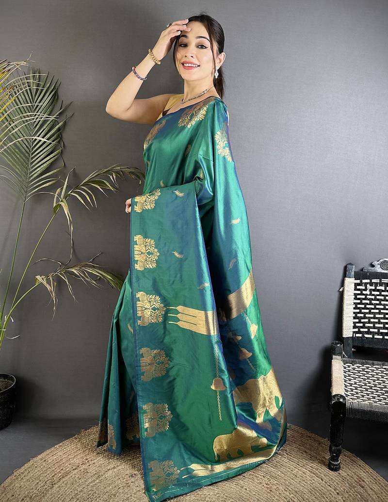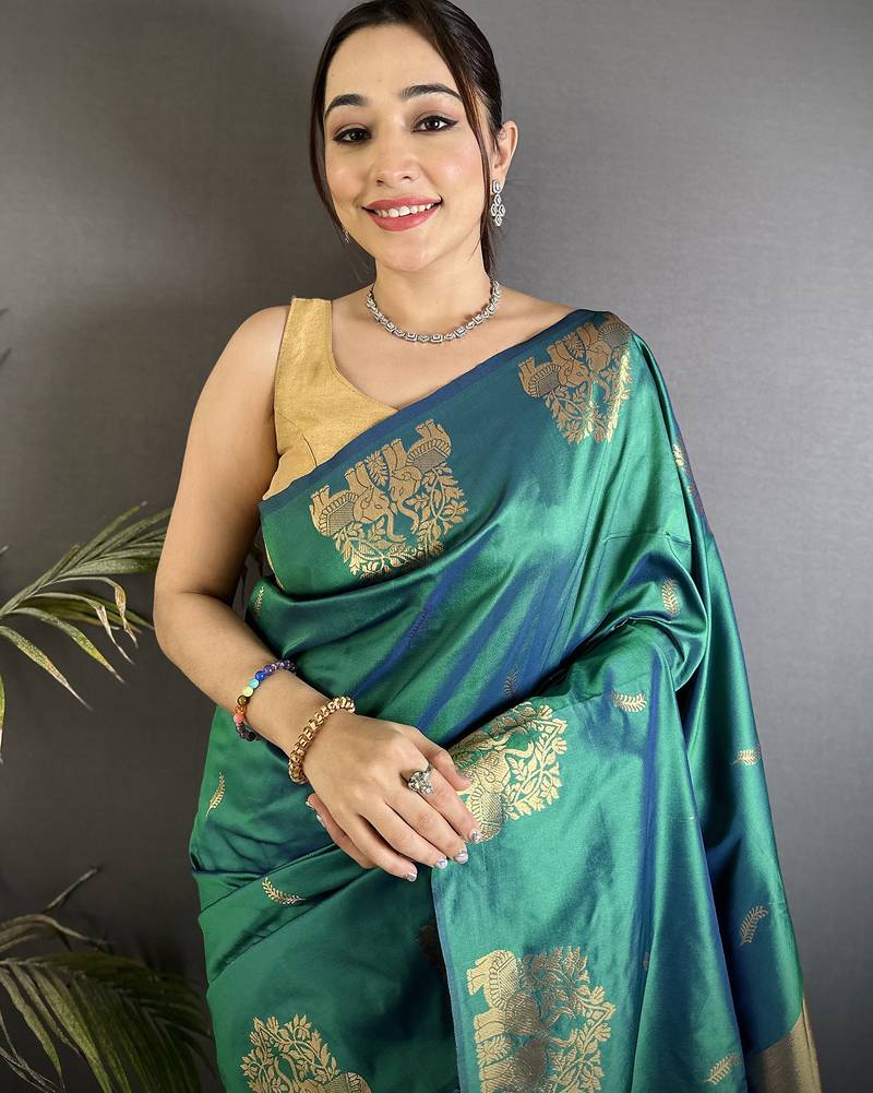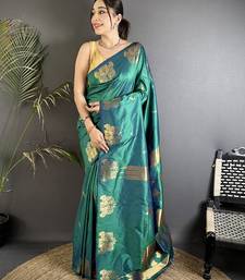 Dark teal soft silk blend mofits zari weaving banarasi saree with unique border
