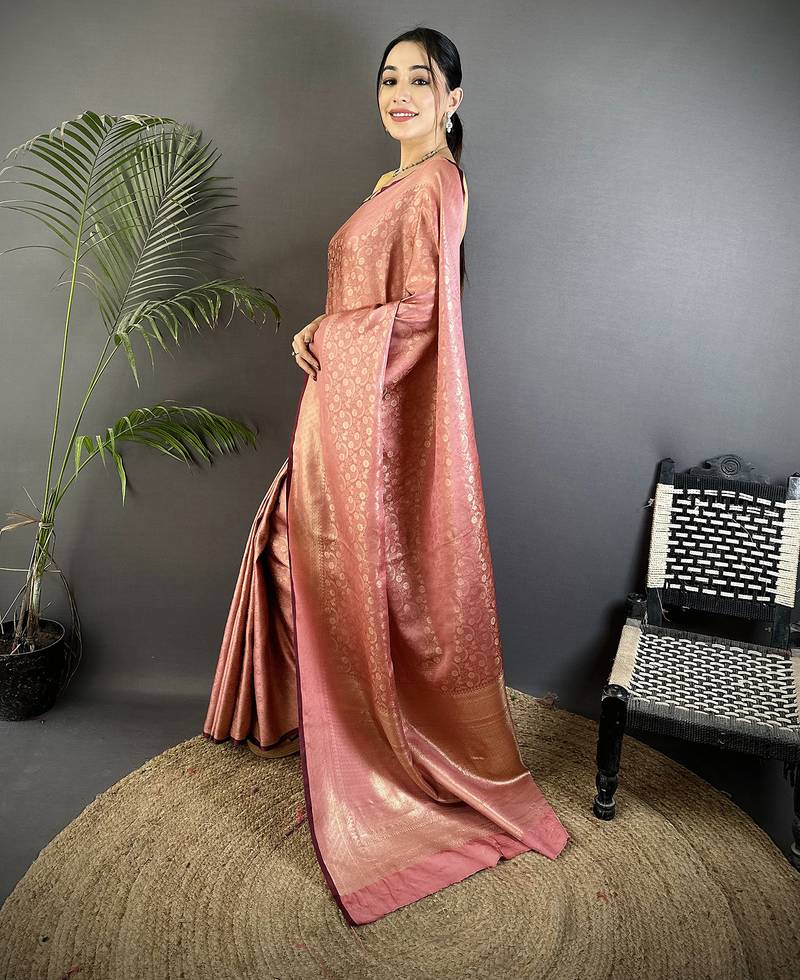 Dusty pink soft satin silk blend floral & paisley motifs banarasi saree