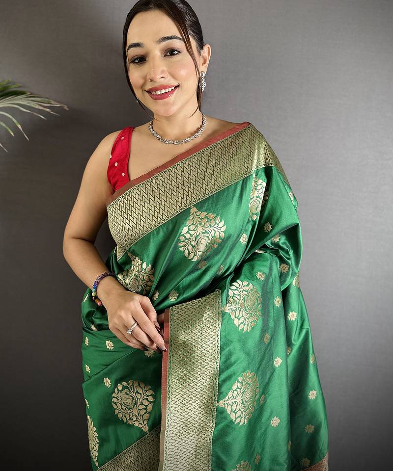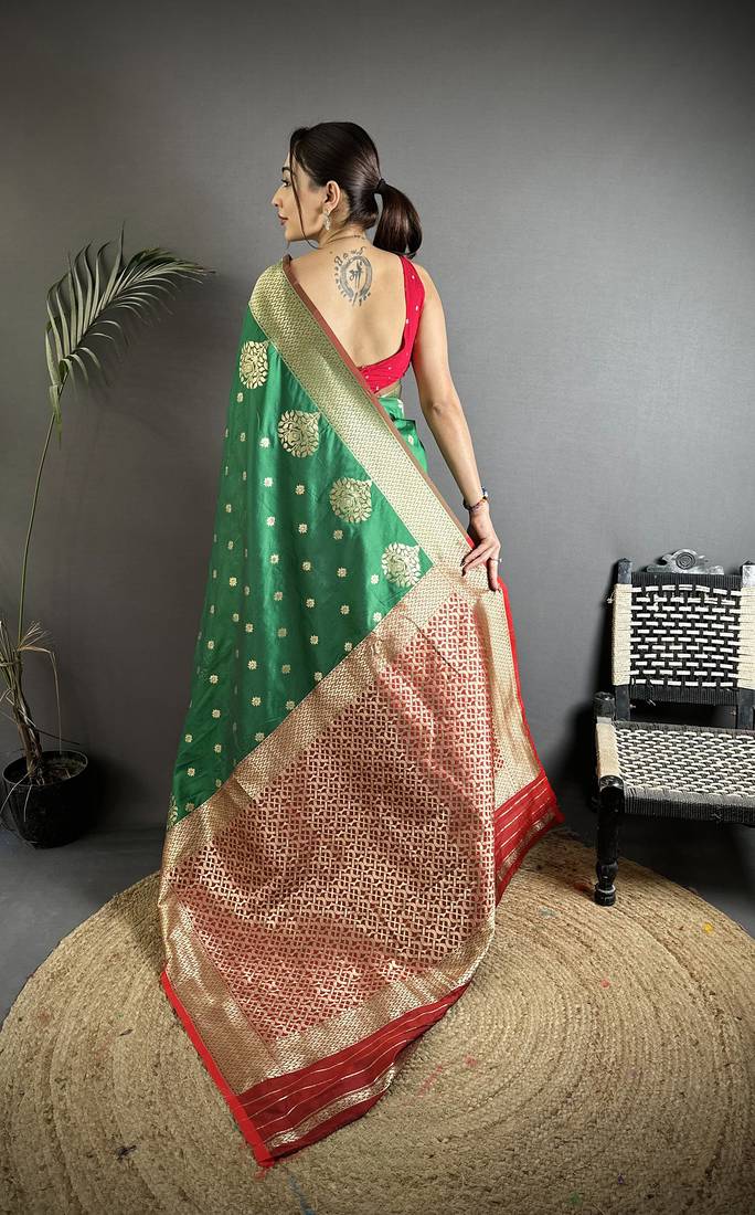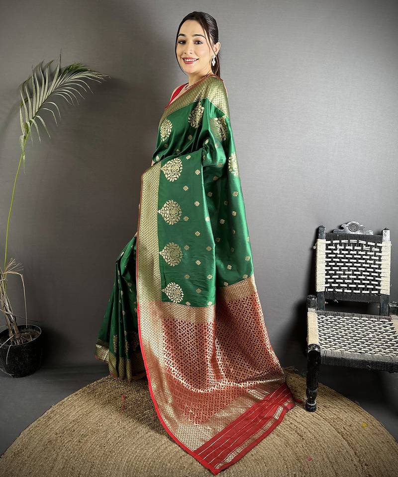 Elora bottle green soft silk blend zari woven butti banarasi saree