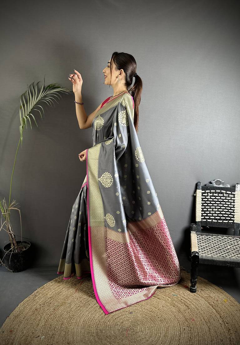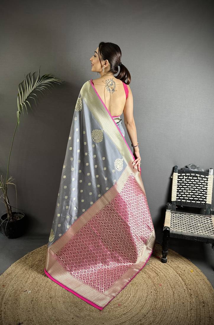 | Product Description | Elevate Your Ethnic Wardrobe With Elora Fashion’s Grey Soft Silk Zari Woven Butti Banarasi Saree A Stunning Bestseller That Effortlessly Blends Tradition And Modern Style. This Elegant Grey Saree Features Intricate Zari Butti Patterns Woven Into Soft Silk, Creating A Graceful Shimmer That’s Perfect For Women Who Love Trending, Top Ranking Ethnic Wear. Lightweight Yet Luxurious, It Promises Comfort Without Compromising On Regal Appeal.