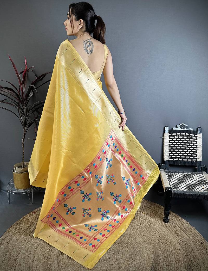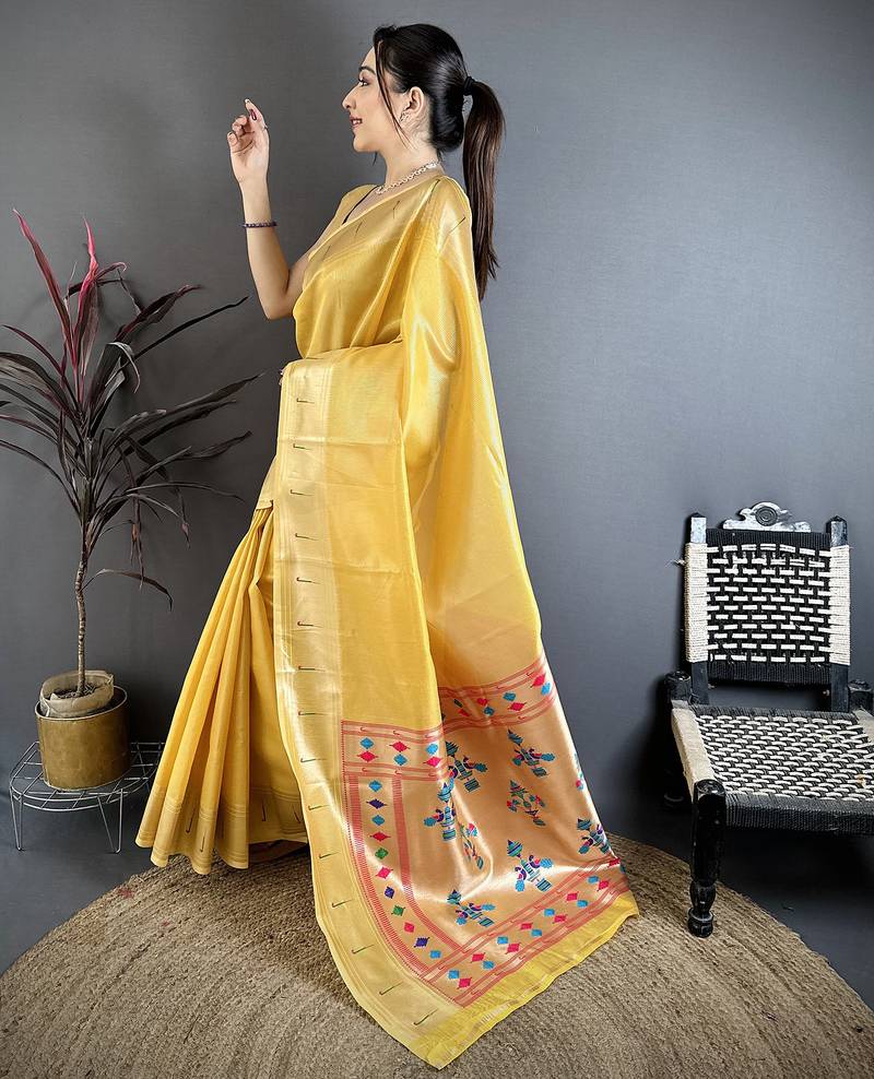 | Product Name | Golden Yellow Tissue Solid Zari Weaving Paithani Saree With Muniya Border | |