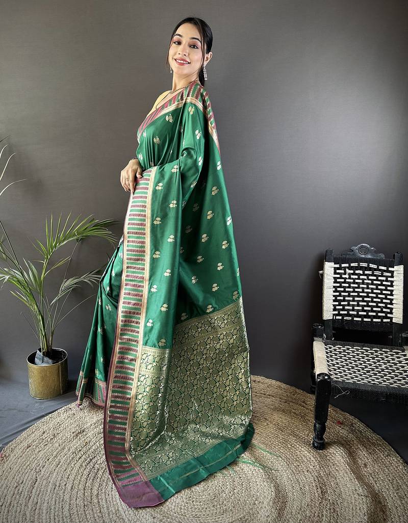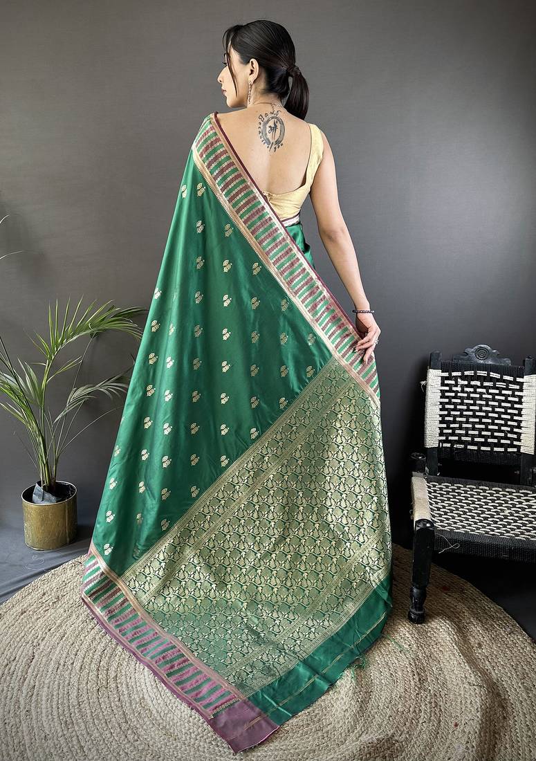 Green lichi silk blend jacquard zari woven motifs banarasi saree