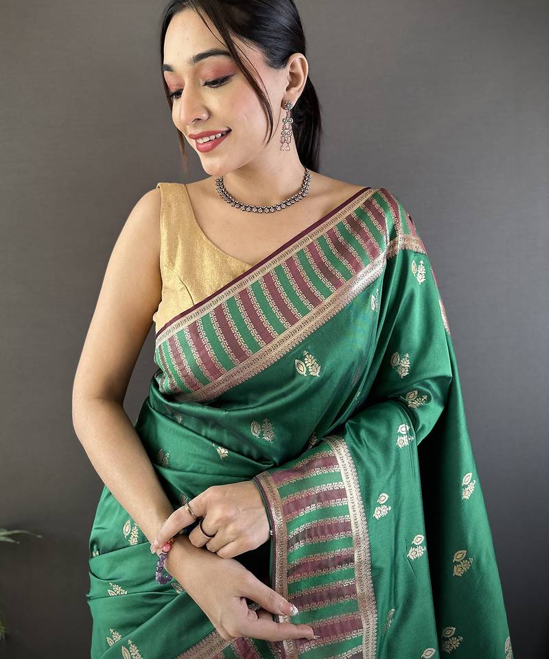 | Product Description | Wrap Yourself In The Lush Charm Of Emerald Dreams With This Green Lichi Silk Jacquard Zari Woven Motifs Banarasi Saree A True Standout In Women’s Ethnic Wear That’s Set To Top Mirraw’s Home Page Searches. Crafted From Smooth, Premium Lichi Silk With Rich Jacquard Weaving, This Saree Glows In Regal Green With Shimmering Zari Motifs That Capture Tradition And Trend In Every Fold. It’s Not Just A Saree It’s Your Next Trending Fashion Moment That Feels Both Heritage‑Rich And Effortlessly Chic.
