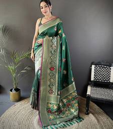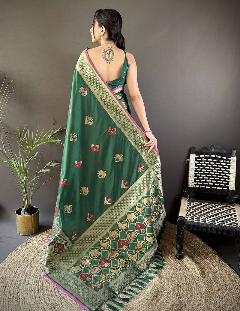 Green soft lichi silk blend elephant & floral motifs minakari work banarasi saree