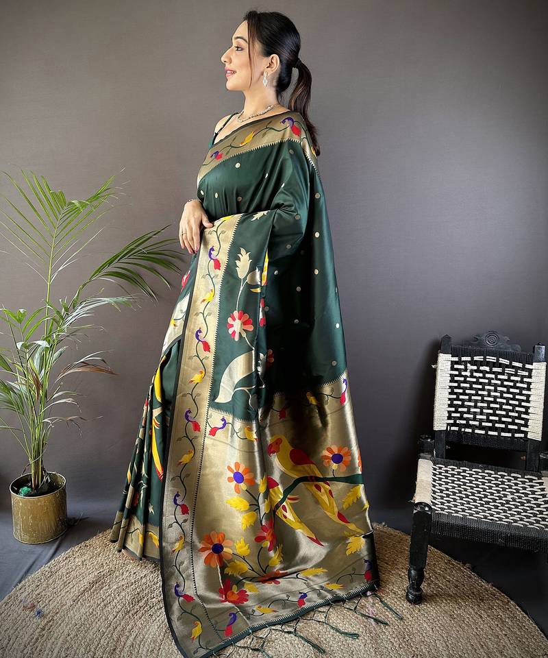 | Product Description | Step Into Elegance With This Green Soft Silk Zari Woven Floral Paithani Saree, A Top Ranking Favorite From Elora Fashion! Featuring Intricate Zari Floral Motifs, This Saree Seamlessly Combines Traditional Artistry With Modern Style, Making It One Of The Most Popular Women's Ethnic Wear Choices On Mirraw. Perfect For Weddings, Festive Occasions, And Special Celebrations, It’s A Bestseller That Exudes Charm And Sophistication.