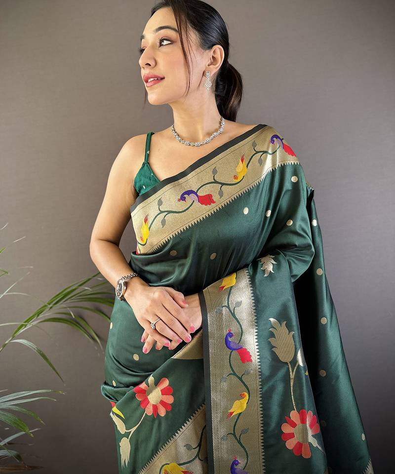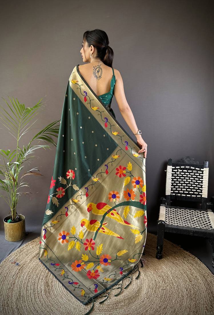| Product Name | Green Soft Silk Blend Zari Woven Floral Motifs Paithani Saree | |