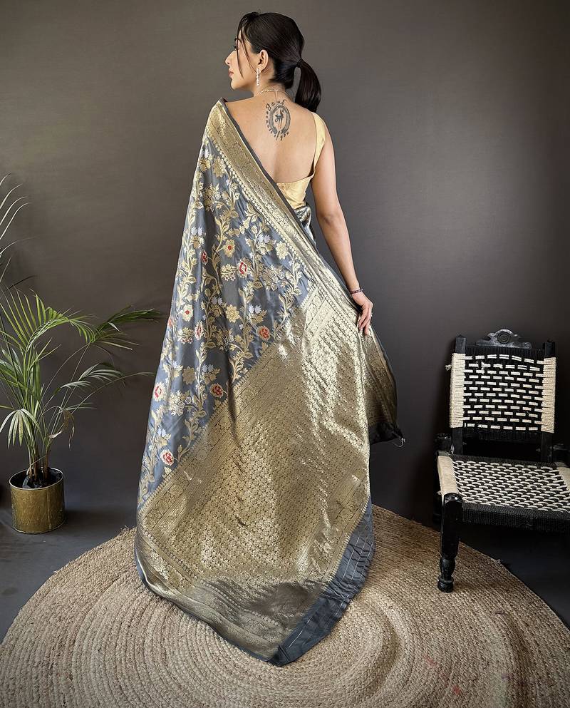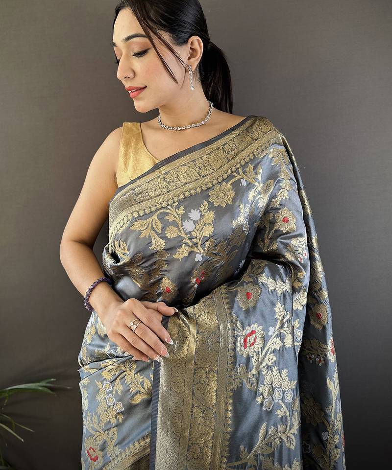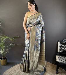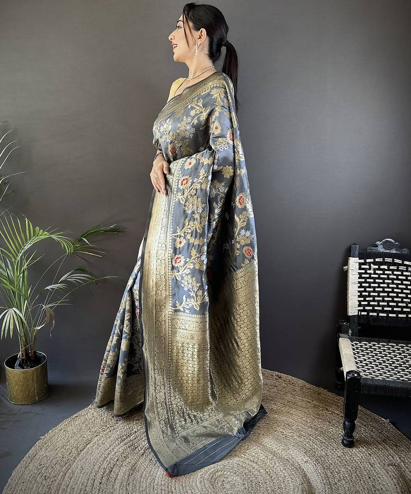 Grey soft banarasi silk blend floral & ethnic motifs meenakari zari weaving banarasi saree