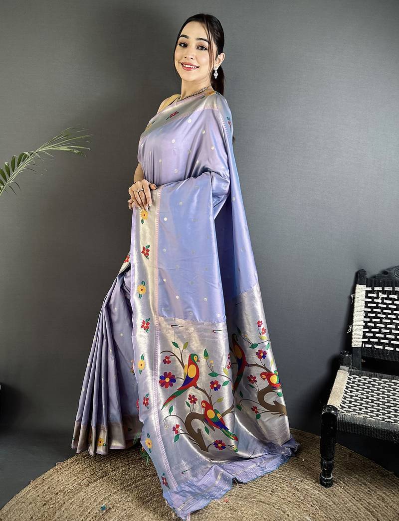 Lavender lichi silk blend parrot & floral woven design zari weaving paithani saree