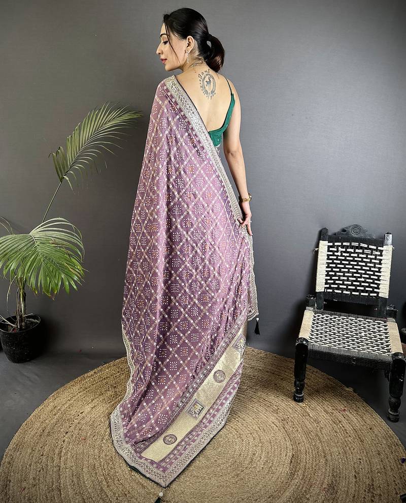 Lavender vichitra silk blend bandhej bandhani with stone & sequence work saree