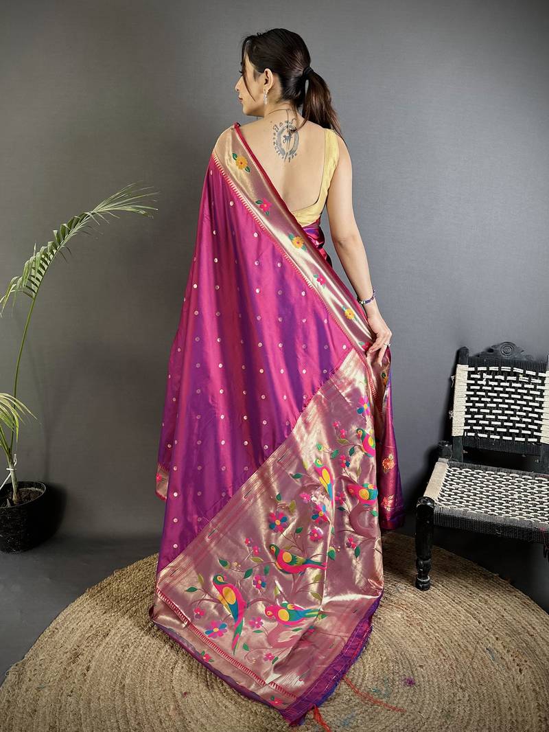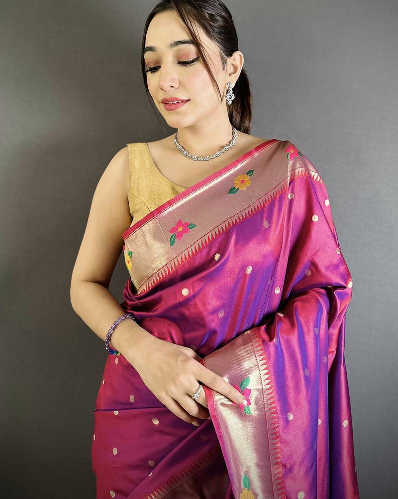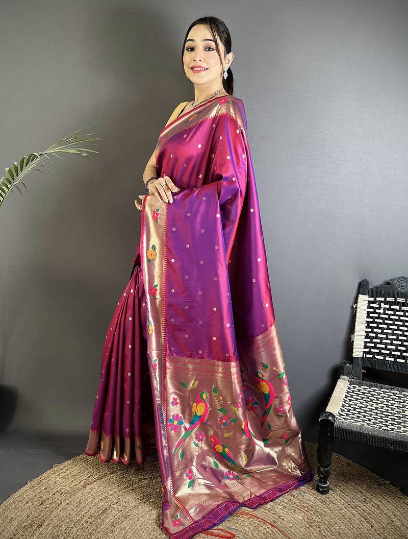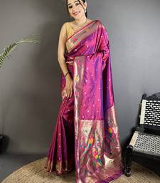 Magenta lichi silk blend parrot & floral woven design zari weaving paithani saree