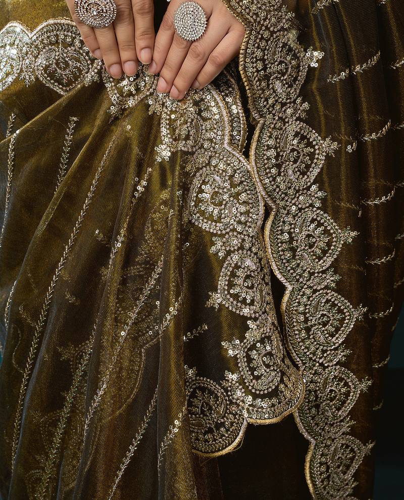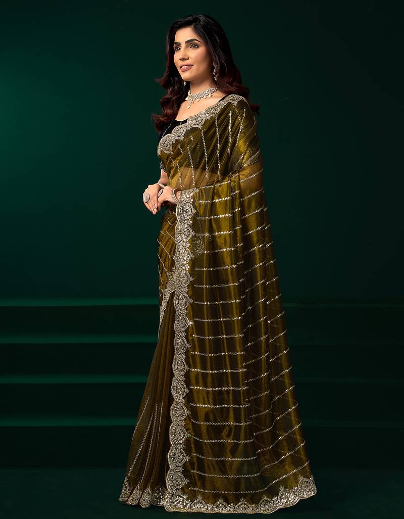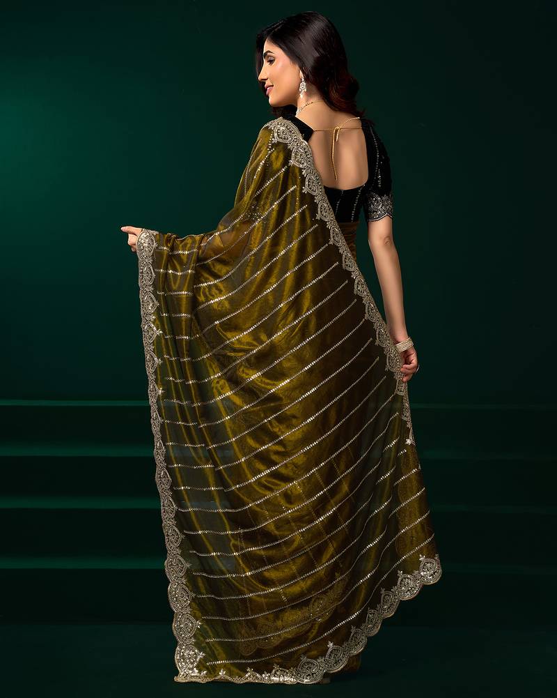 Mehendi green net shimmering lines sequence embroidery party wear saree