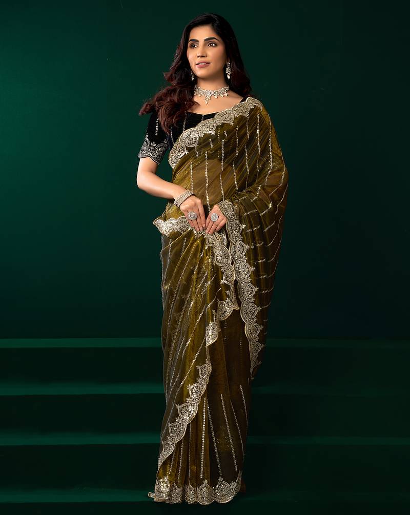 | Product Name | Mehendi Green Net Shimmering Lines Sequence Embroidery Party Wear Saree | |