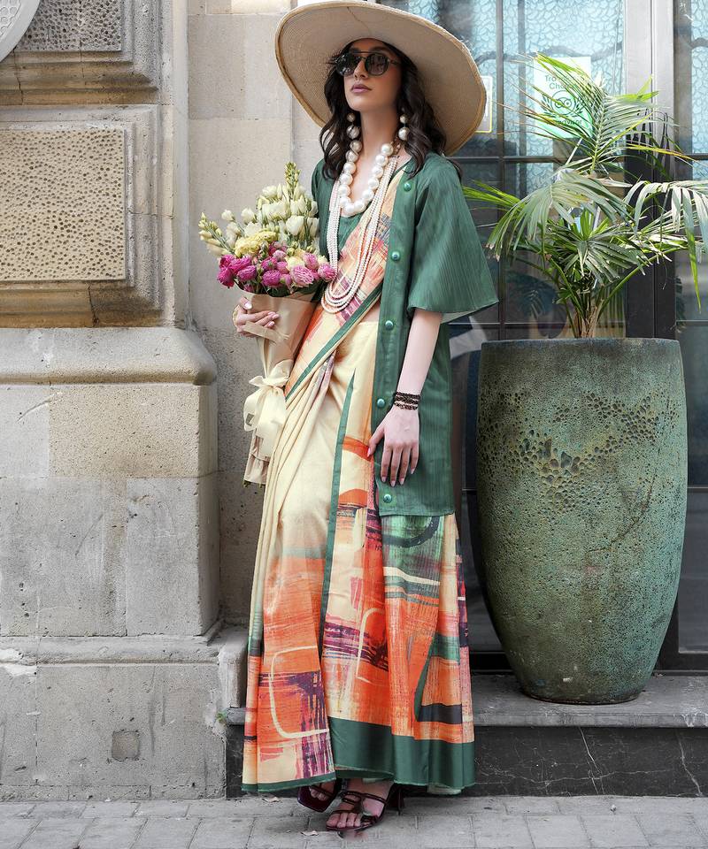 Multicolor northern light twirl silk modern digital print bollywood saree