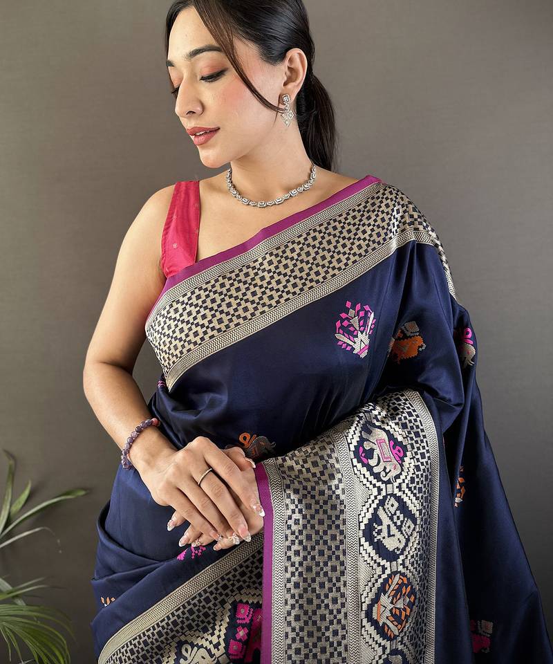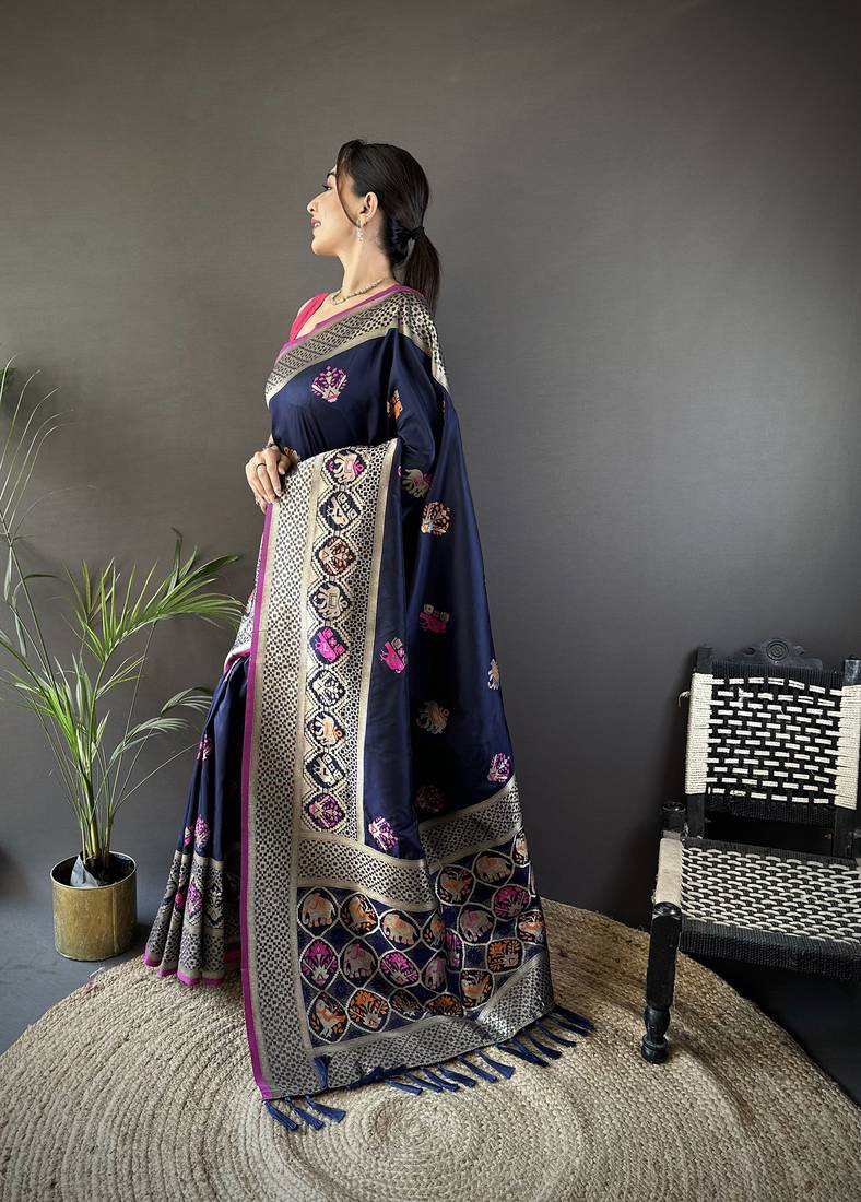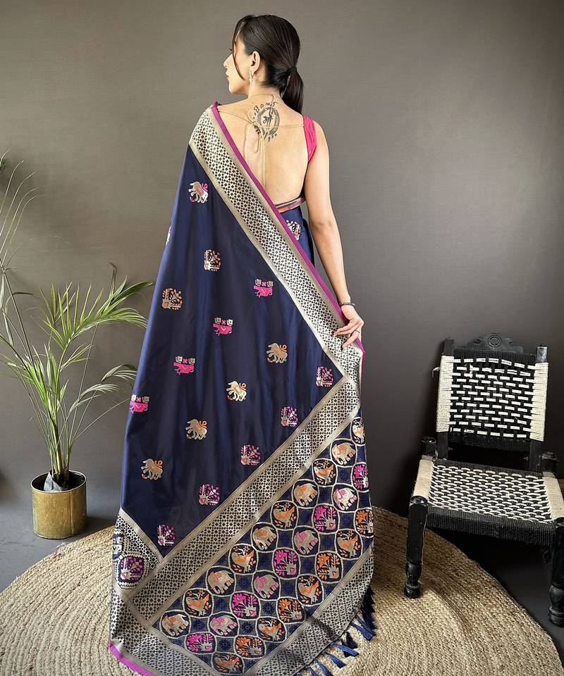 Navy blue soft lichi silk blend elephant & floral motifs minakari work banarasi saree