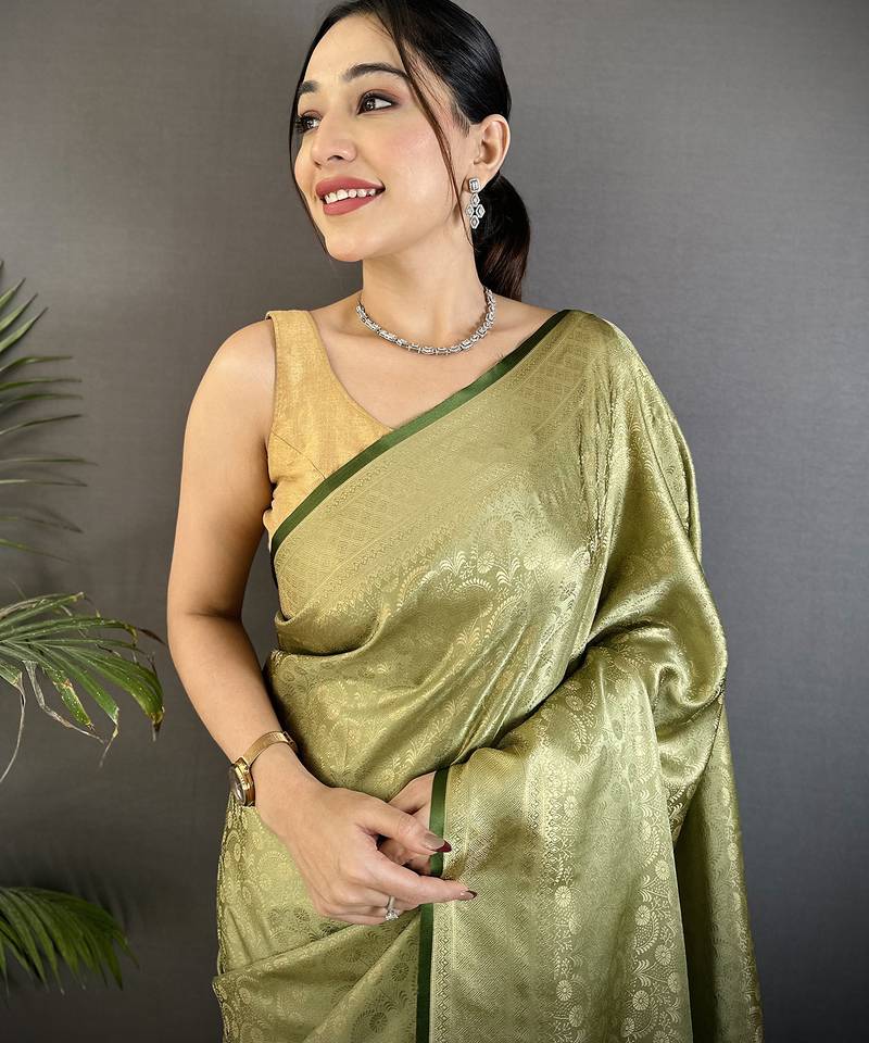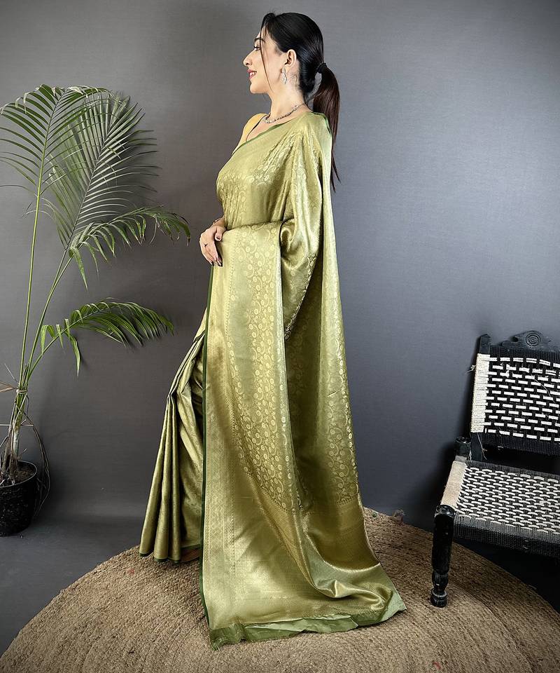 | Product Description | Wrap Yourself In Effortless Charm With This Olive Green Soft Satin Silk Banarasi Saree A Standout Choice In Women’s Ethnic Wear That Blends Timeless Tradition With Today’s Hottest Trends. Rich Floral And Paisley Motifs Decorated Across Smooth Satin Silk Bring A Fresh Twist To Classic Drapes. Whether It’s Festive Celebrations, Special Occasions, Or Casual Gatherings, This Saree Brings A Perfect Blend Of Elegance And Cool Style.
