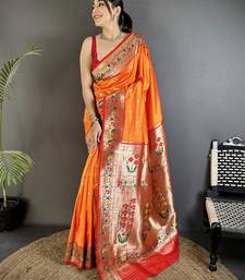 Orange lichi silk blend ikkat floral motifs zari woven paithani saree
