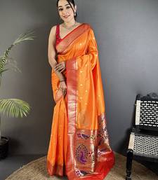 Orange lichi silk blend paithani peacock motifs zari work saree