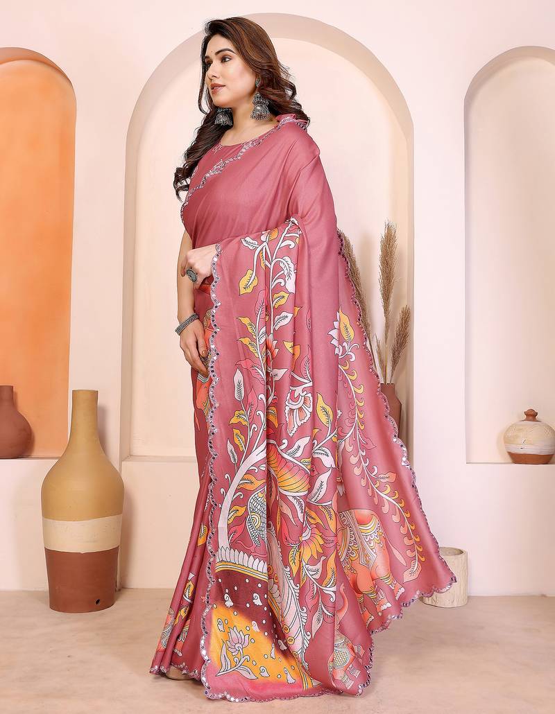 | Product Name | Peach Manipuri Kalamkari & Digital Print Saree With Mirror Work Border | |