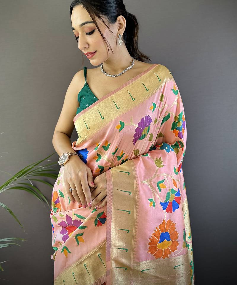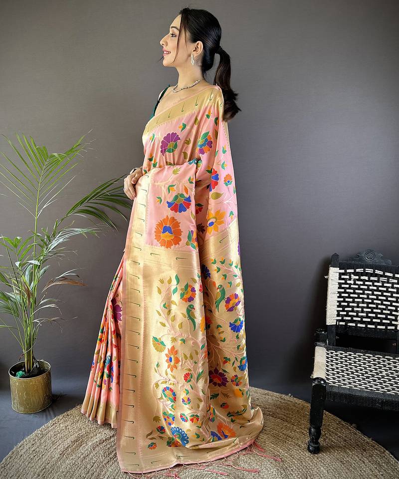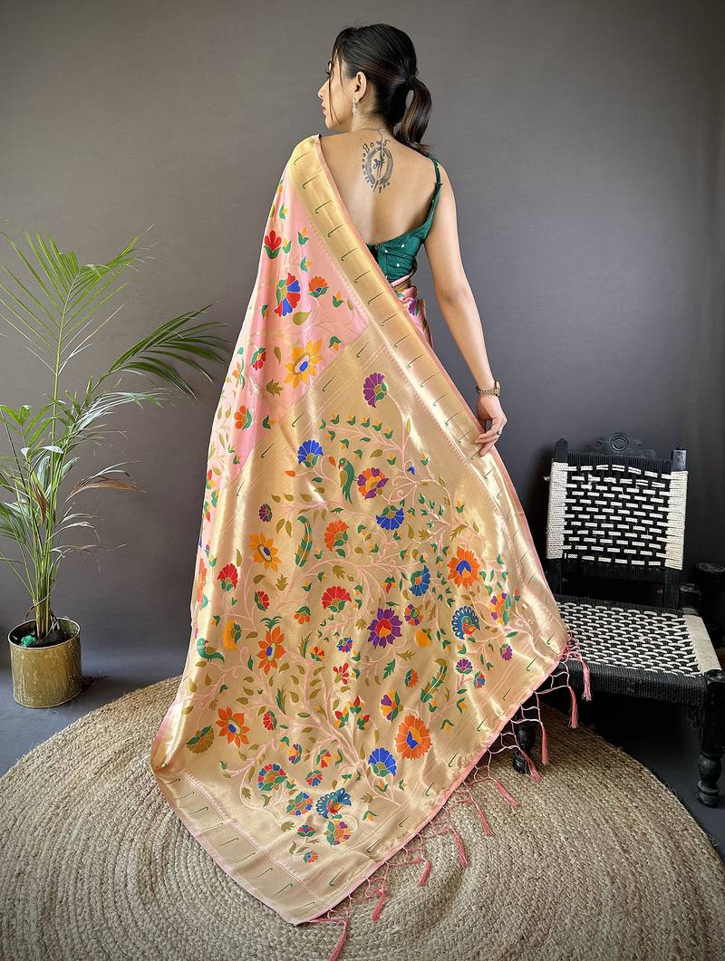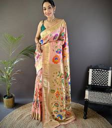 Peach soft silk blend zari woven floral motifs paithani saree