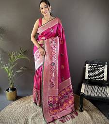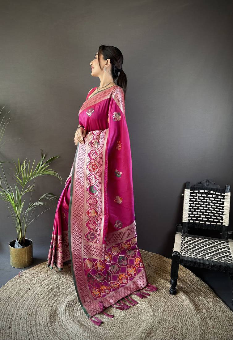 Pink soft lichi silk blend elephant & floral motifs minakari work banarasi saree