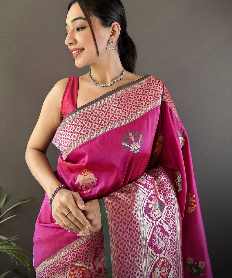 | Product Name | Pink Soft Lichi Silk Blend Elephant & Floral Motifs Minakari Work Banarasi Saree | |