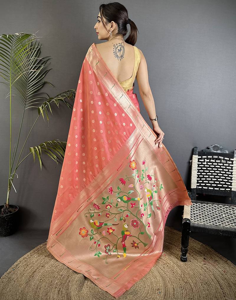 Pink tissue parrot & floral woven design paithani saree