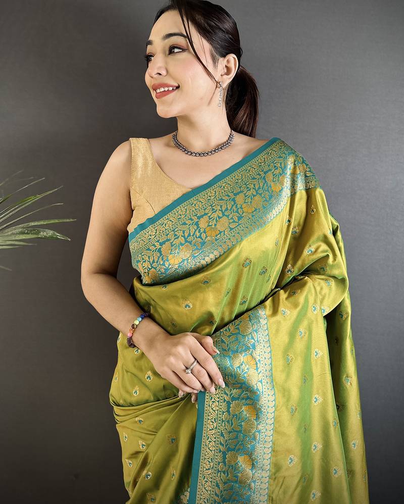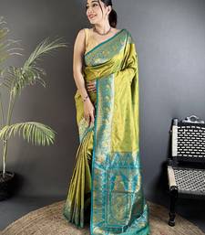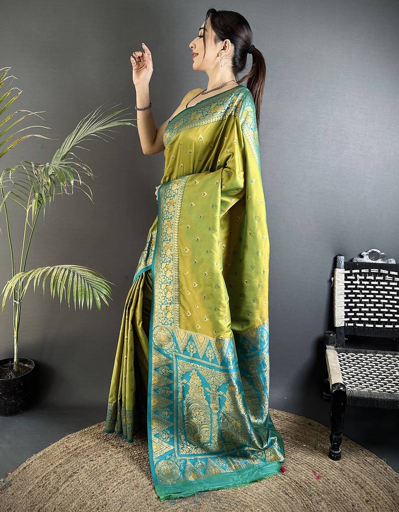 Pista green soft silk blend intricate motifs zari weaving banarasi saree with contrast weaving border