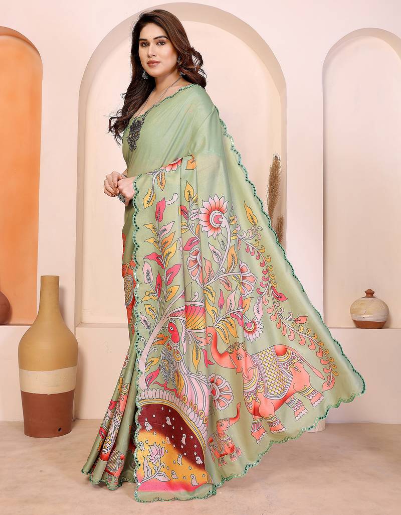 | Product Name | Pista Manipuri Kalamkari & Digital Print Saree With Mirror Work Border | |