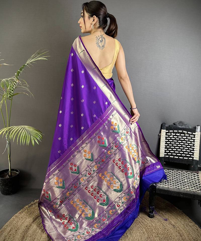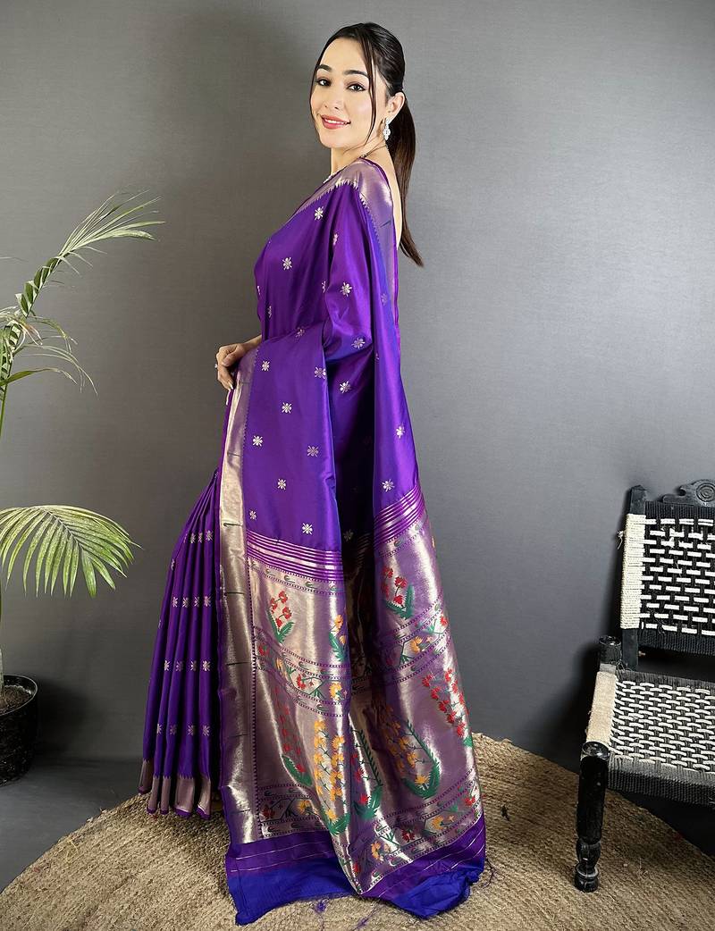 Purple lichi silk blend floral ikkat motifs zari weaving paithani saree