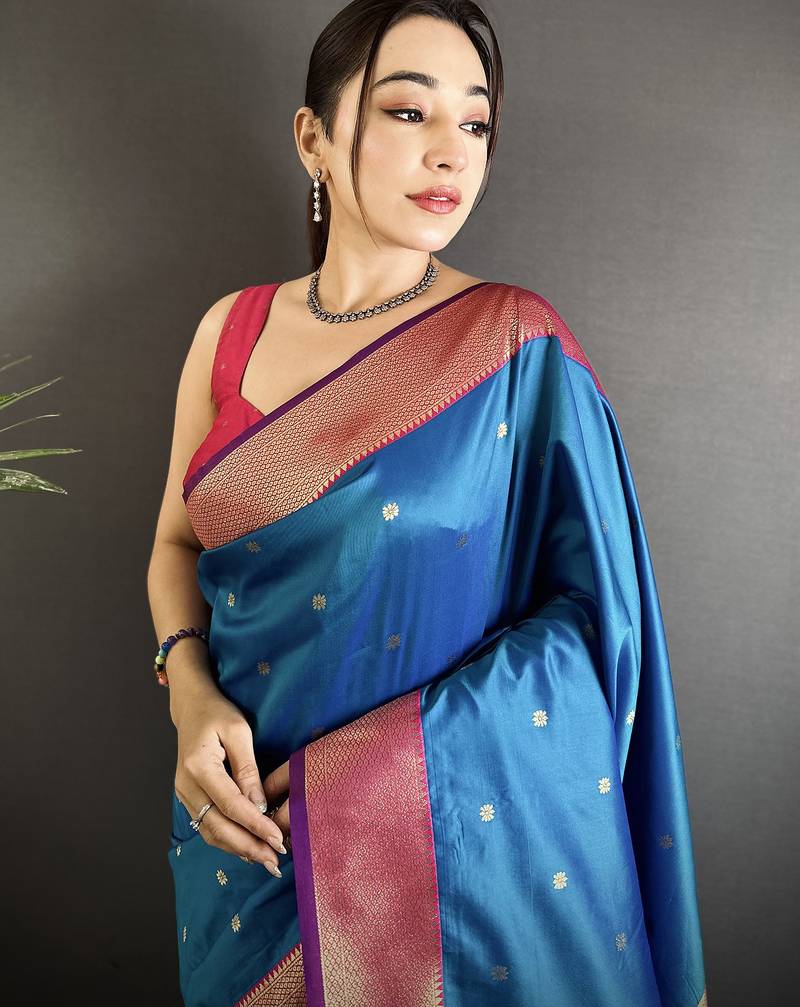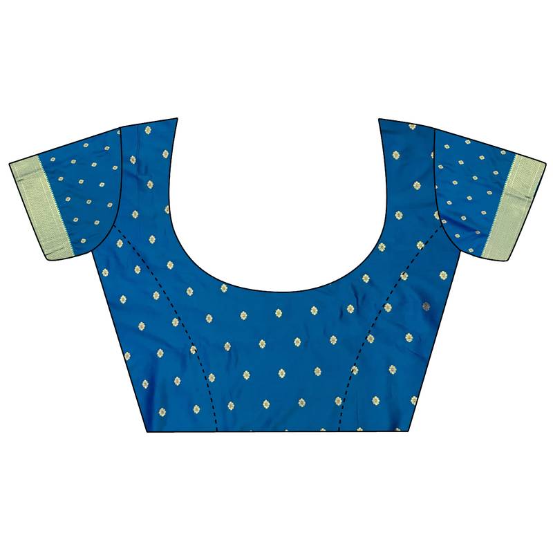 | Product Name | Rama Blue Lichi Silk Blend Peacock Motifs Zari Weaving Paithani Saree | |