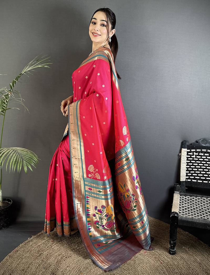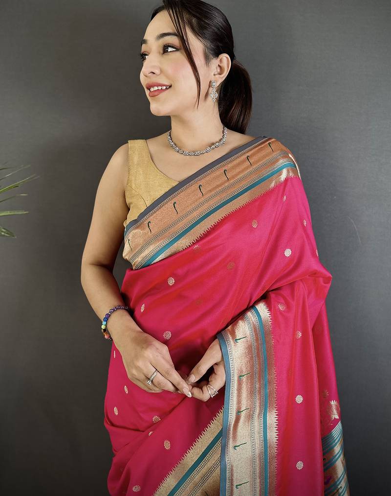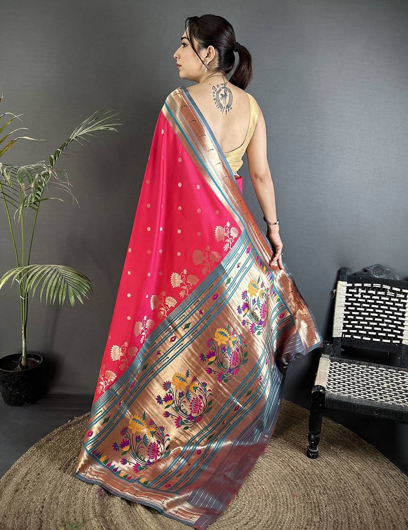 Rani pink lichi silk blend floral motifs zari weaving paithani saree