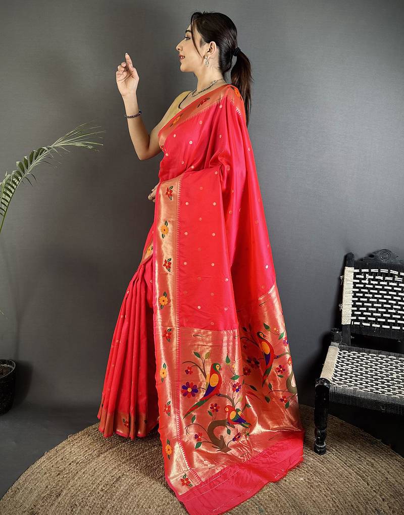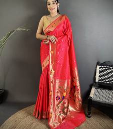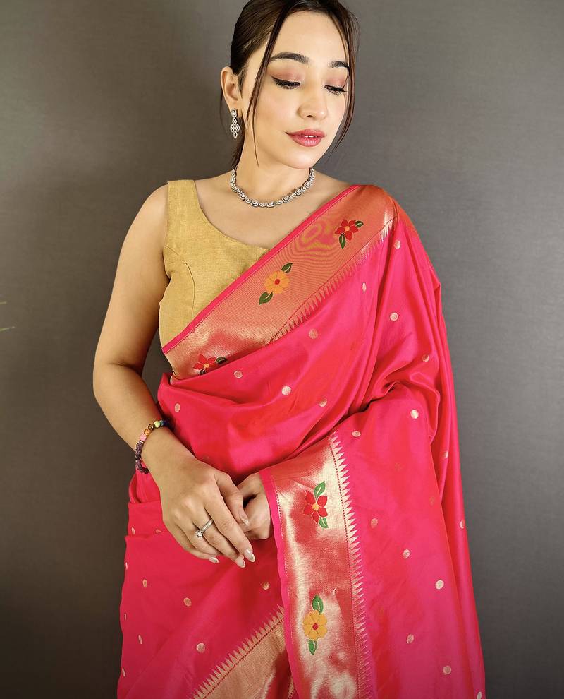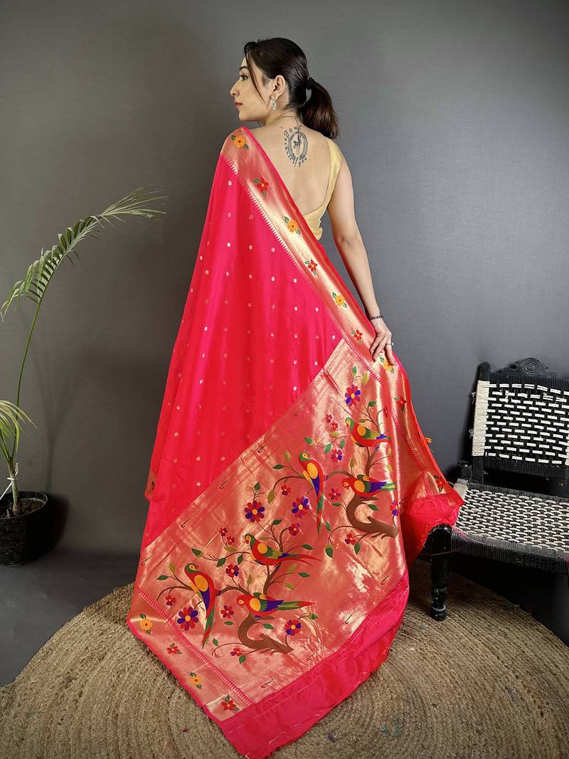 Rani pink lichi silk blend parrot & floral woven design zari weaving paithani saree