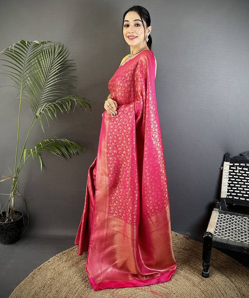 Rani pink soft satin silk blend floral & paisley motifs banarasi saree