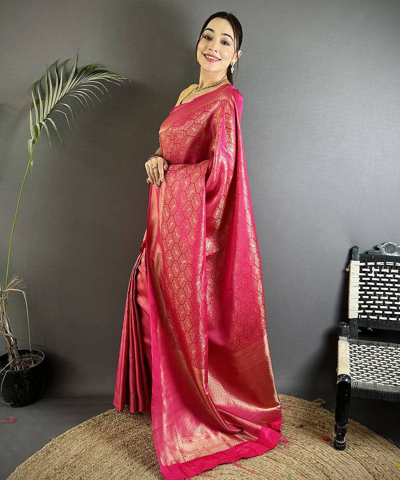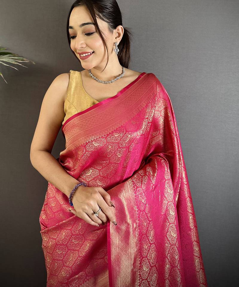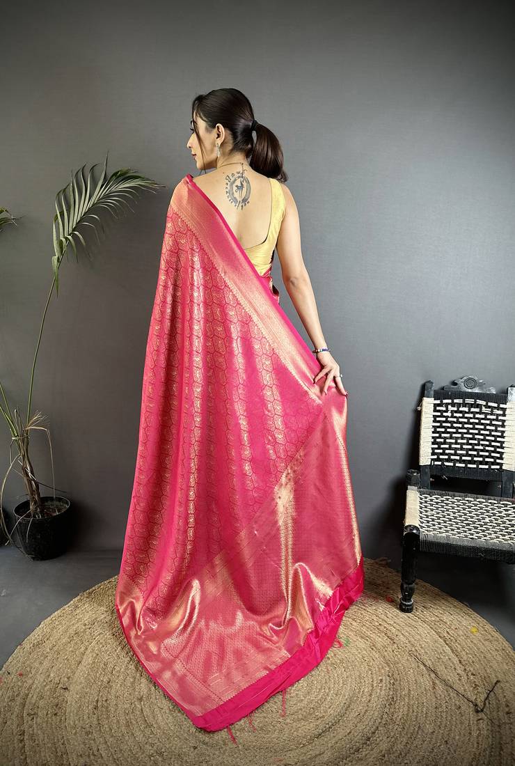 Rani pink soft satin silk blend paisley & floral banarasi saree