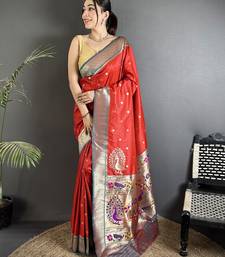 | Product Description | Make A Statement With This Red Lichi Silk Paithani Saree, Featuring Exquisite Peacock Motifs. The Vibrant Red Shade Adds Charm And Elegance, Perfect For Weddings, Festivals, And Special Celebrations.