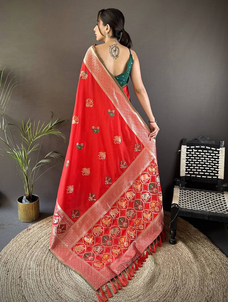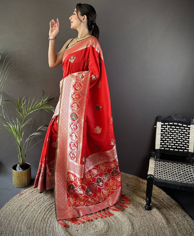 Red soft lichi silk blend elephant & floral motifs minakari work banarasi saree
