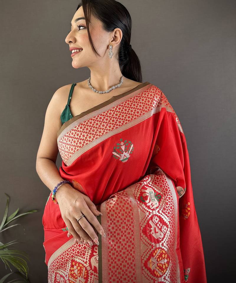 | Product Description | Ignite Every Celebration With This Red Soft Lichi Silk Banarasi Saree Adorned With Elegant Elephant And Floral Minakari Motifs A Fiery Blend Of Tradition And Trend That Shines In Women’s Ethnic Wear. This Stunning Piece Ranks Among The Top Trending, Most Popular Sarees Women Are Loving On Mirraw. With Its Rich Red Hue And Luxurious Lichi Silk Drape, It’s A Definite Bestseller Product In Mirraw Designs & Styles, Perfect For Weddings, Festive Moments, And Standout Style Statements.