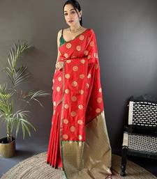 Red soft silk blend checked & circular motifs zari weaving banarasi saree