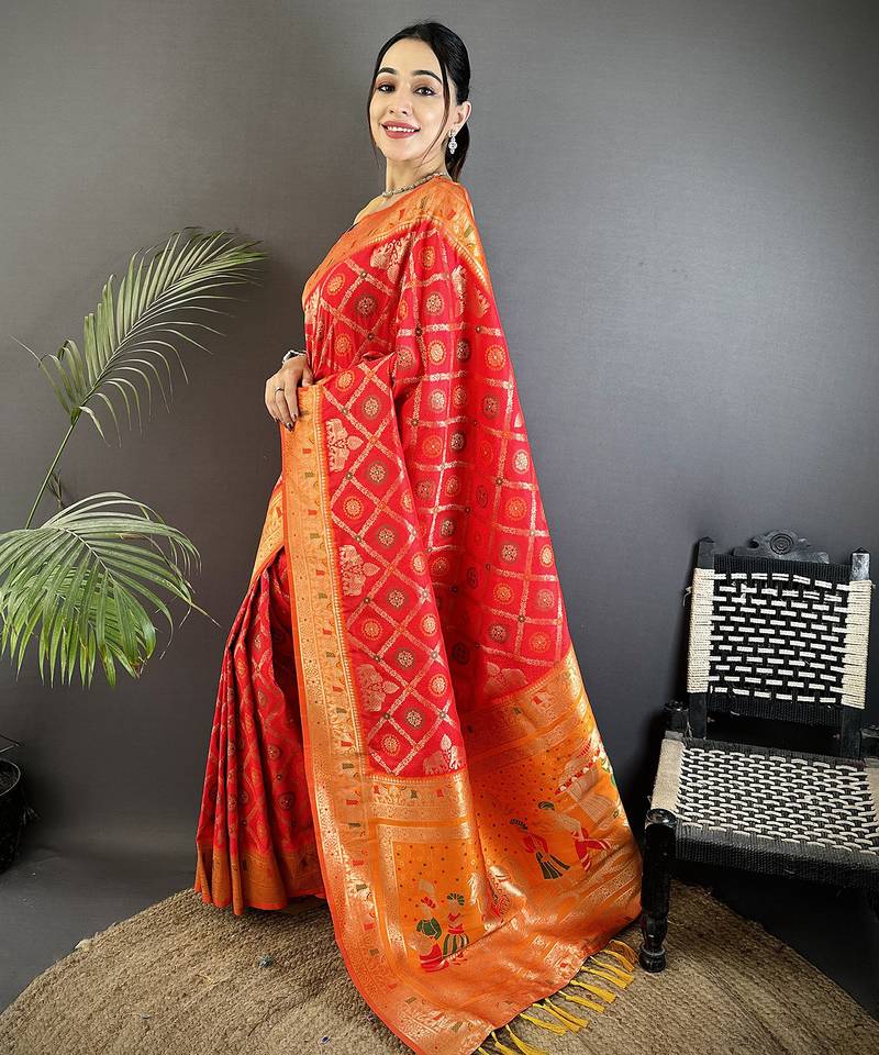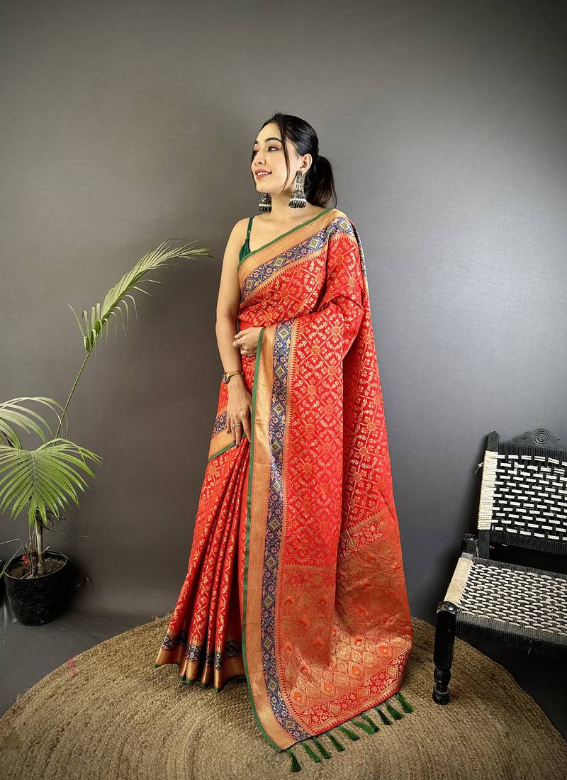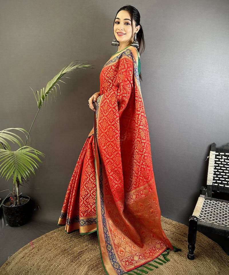 Turn Every Moment Into A Celebration With The Red Soft Silk Zari Weaving Patola Saree, Crafted For Women Who Love Bold Colours And Timeless Indian Artistry. This Stunning Red Drape Shines Bright Among Mirraw’s Top Ranking Women’s Ethnic Wear Collections, Making It The Perfect Blend Of Elegance, Comfort And Festive Charm. Soft, Smooth And Full Of Vibrance, It’s Designed To Make You Feel Your Most Confident Self.