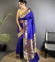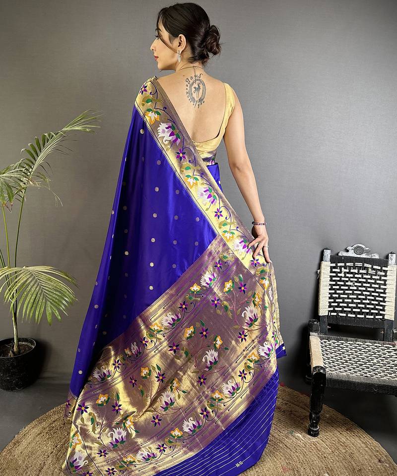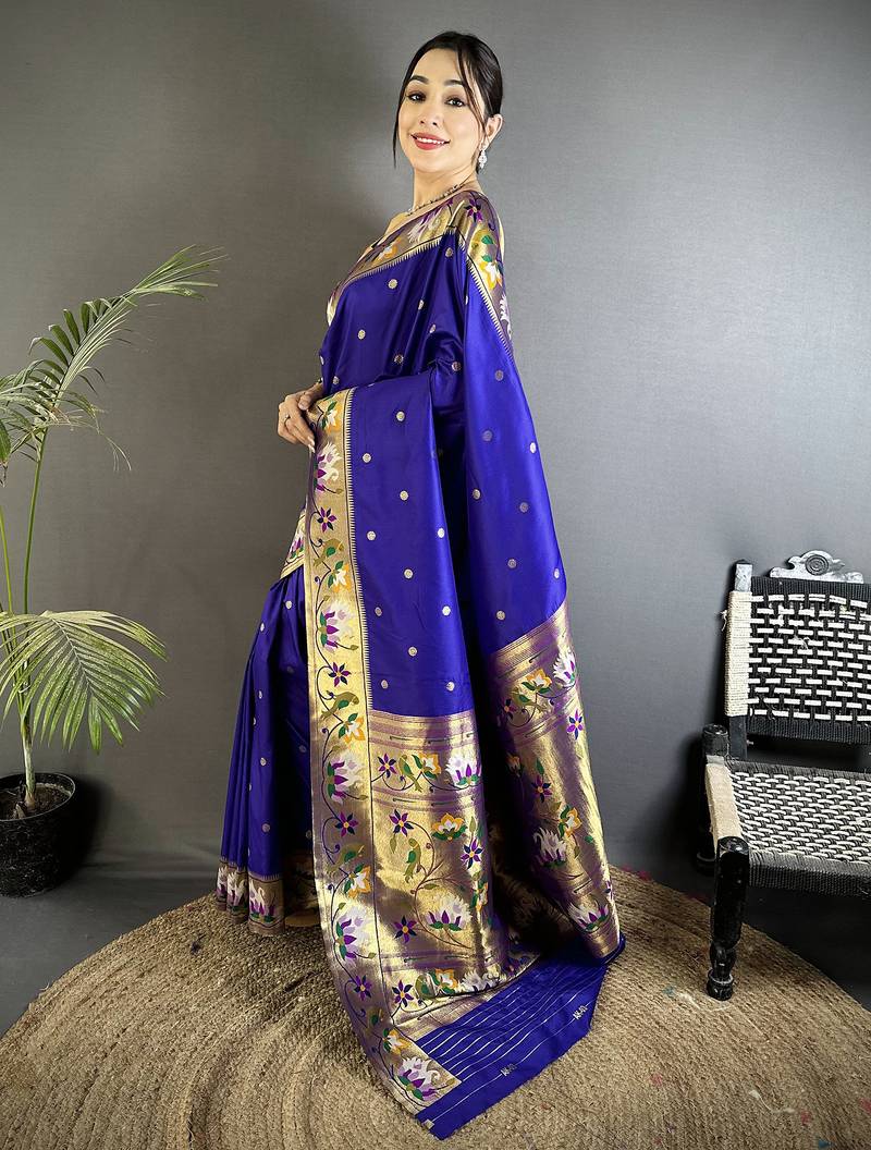 Royal blue lichi silk blend floral & meena weaving zari worked paithani saree