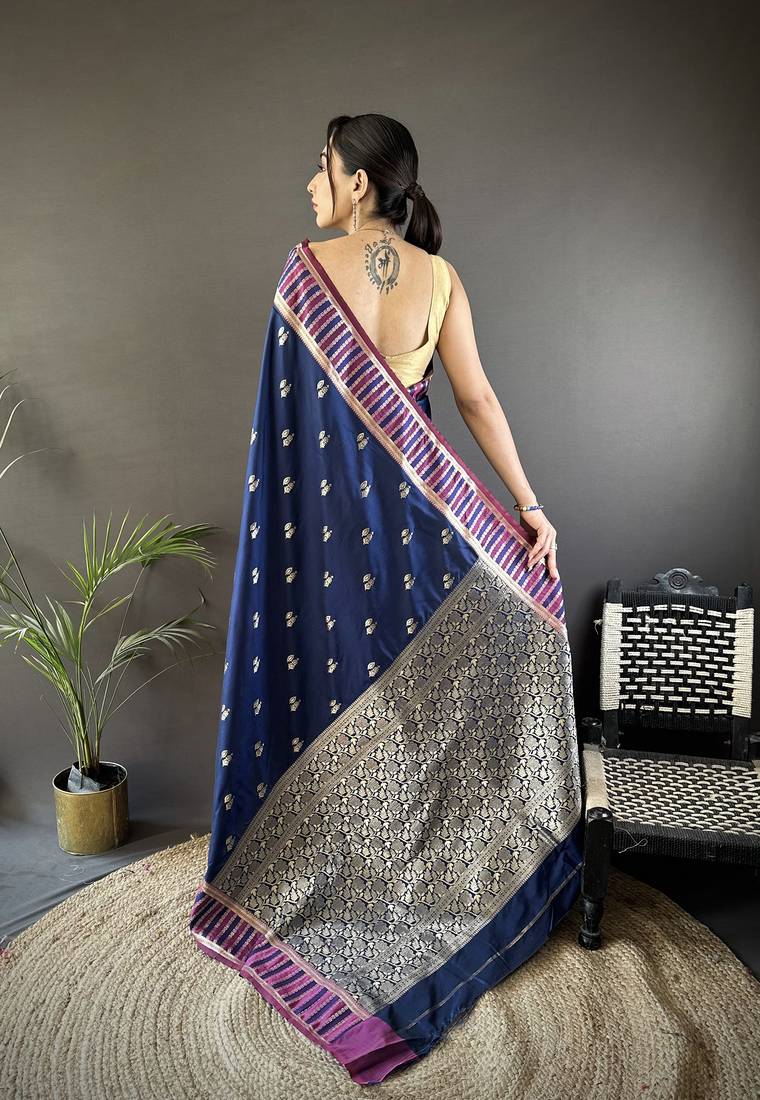 Royal blue lichi silk blend jacquard zari woven motifs banarasi saree